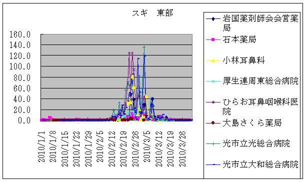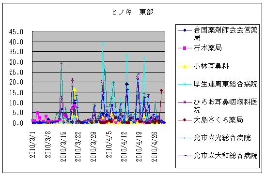 | 東部 | 岩国 | 小林耳鼻科 | ヒノキ | 0.0 | → | 0.6 | 0.6 | 0.3 | 3.1 | 0.6 | 0.0 | 0.0 | 0.0 | 0.3 | 0.0 | 0.0 | 0.0 | 0.0 |