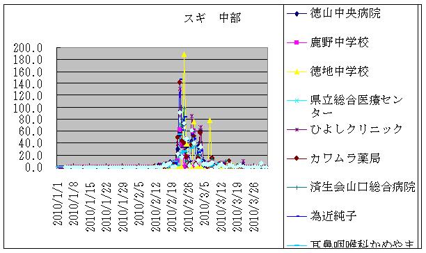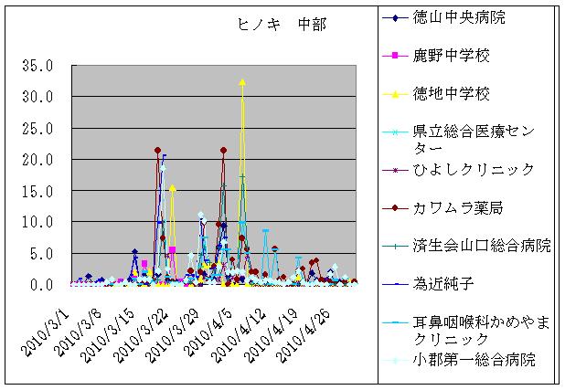 | 中部 | 徳山 | 徳山中央病院 | ヒノキ | 5.9 | 9.3 | 1.3 | 0.0 | 0.6 | 0.9 | 0.6 | 0.3 | 0.3 | 0.0 | 0.0 | 0.0 | 0.0 | 0.0 | 0.0 |